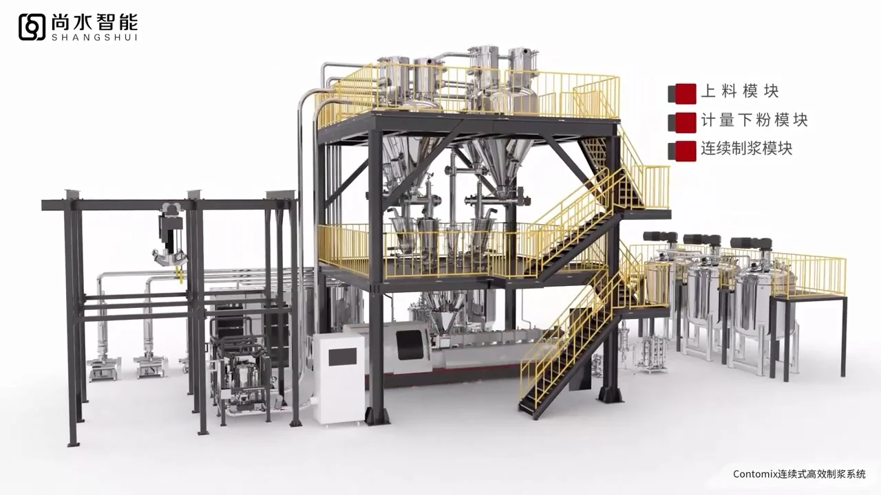 区别于传统双螺杆制浆装备仅具有螺杆部件的结构形式,尚水智能自主研发的双螺杆制浆系统采用“双螺杆捏合+连续剪切分散”的结构设计,在双螺杆设备尾端集成了高速连续分散模块。该系统具有制浆效率高、分散效果好、单位能耗低、产能大、智能化程度高等特点,适配多种制浆工艺和材料体系。单套系统产能最高可达2.500Lhh,连续计量动态精度±(0.5-5)%。